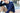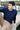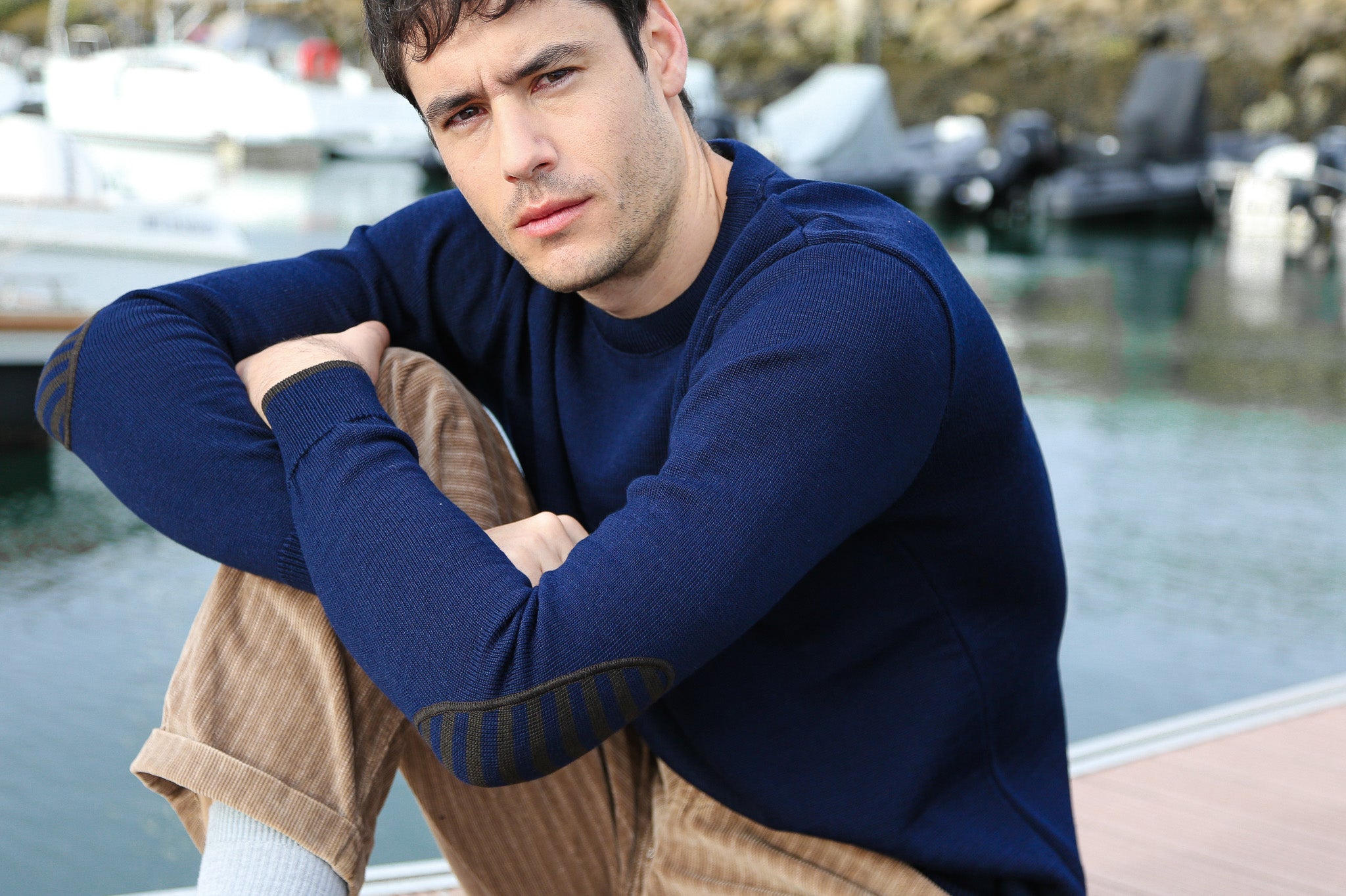 Pull en 50% laine mérinos, 50% acrylique uni marine avec coudières rayées choco/marine, bas resserré, bouts de manches resserés.