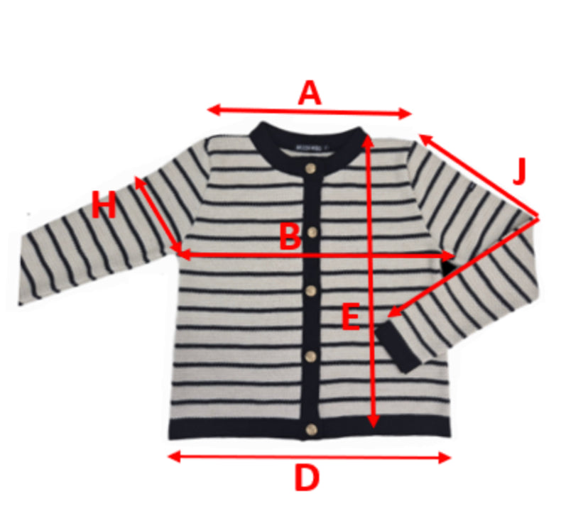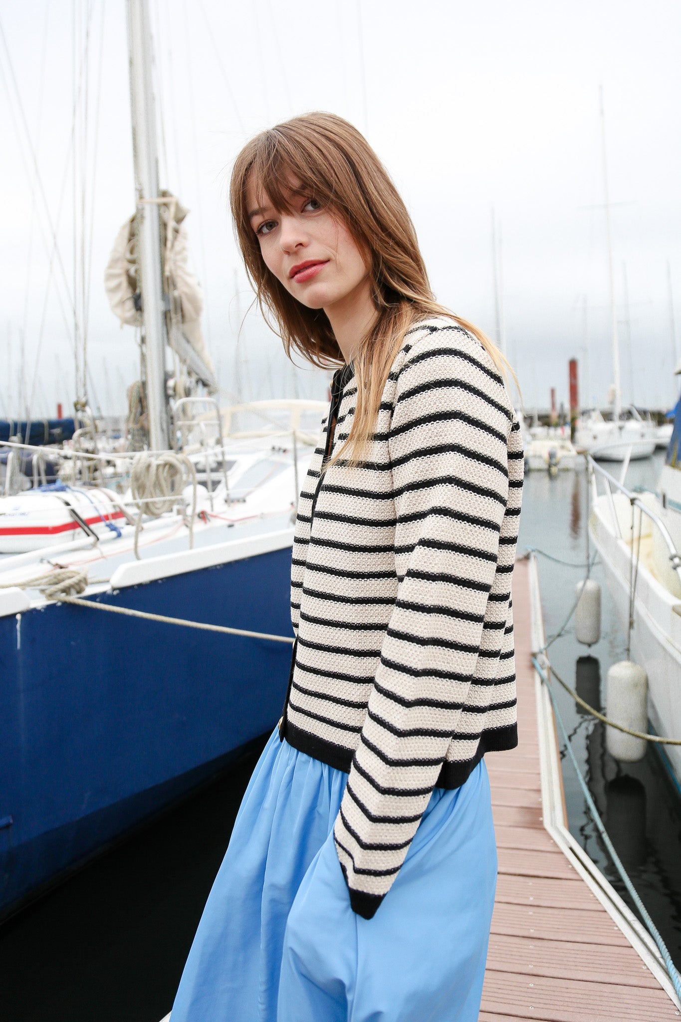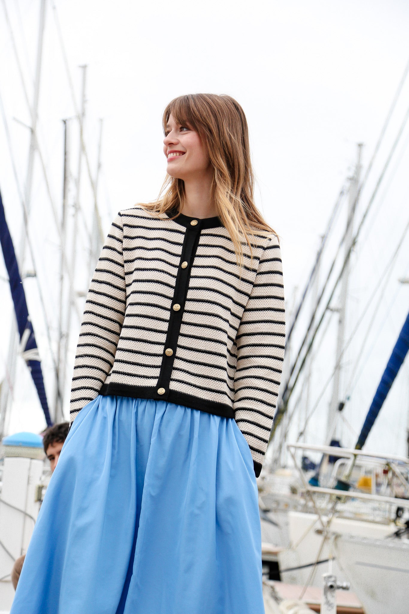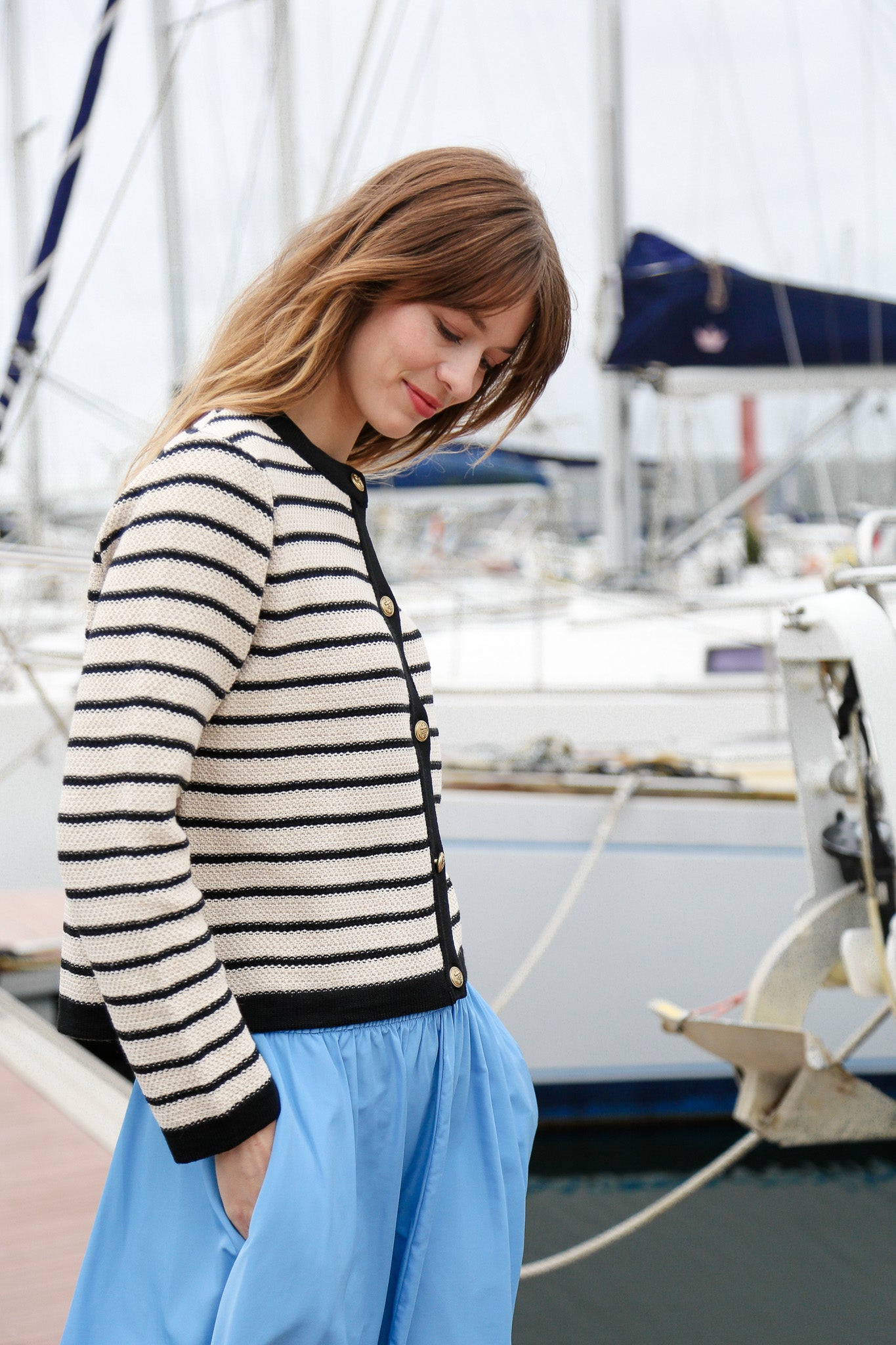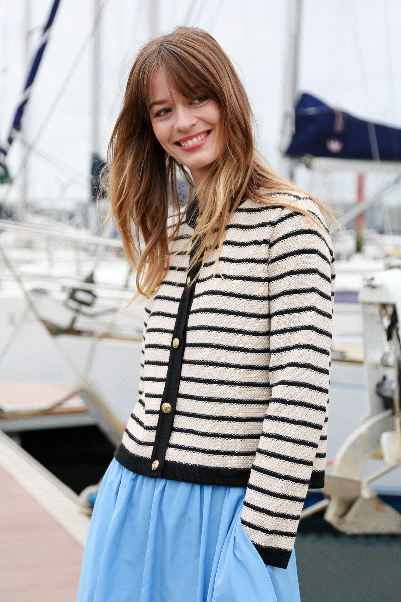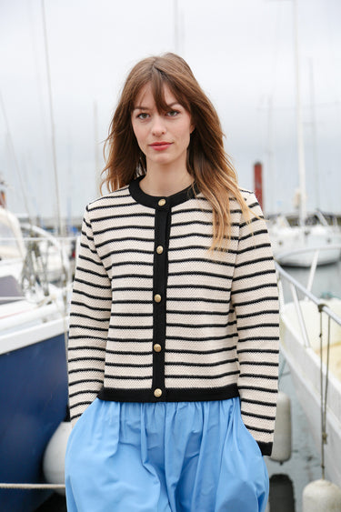 Cardigan-veste en maille 50% mérinos, 50% acrylique, fond beige rayé noir avec des boutons dorés.