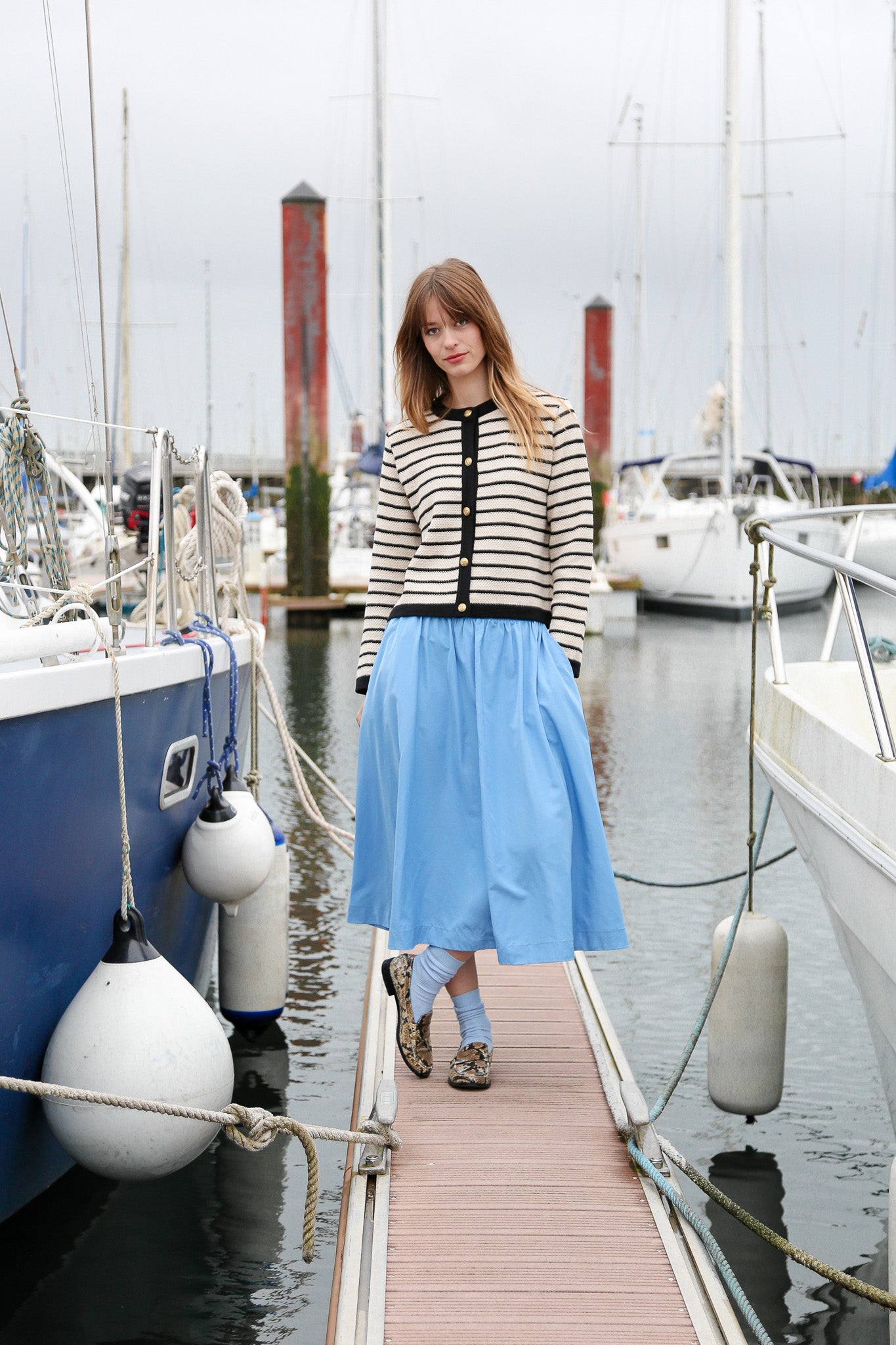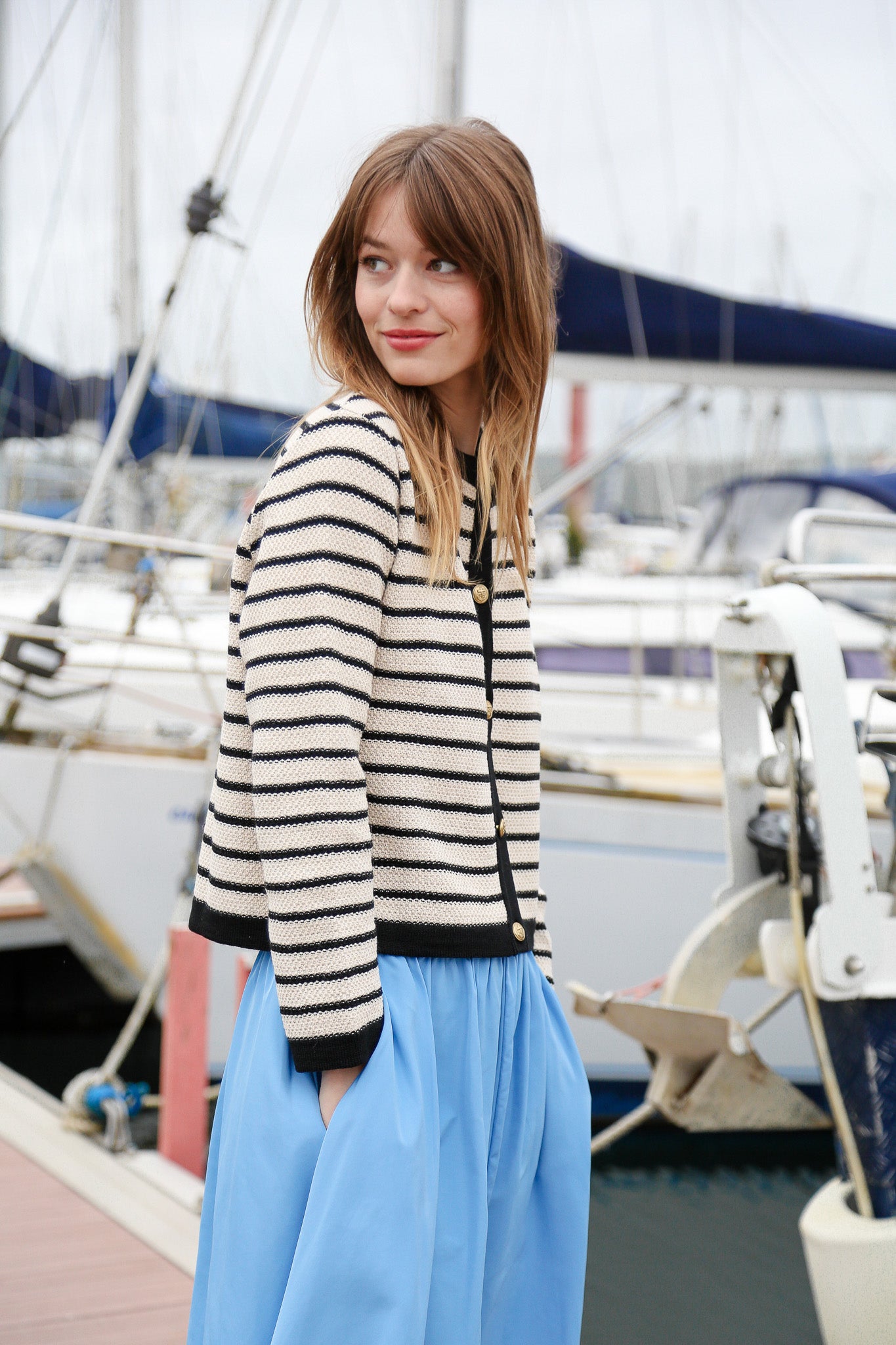 Le cardigan est tricoté, coupé et cousu à Rohan (56) avec un fil en provenance d'une filature italienne.
