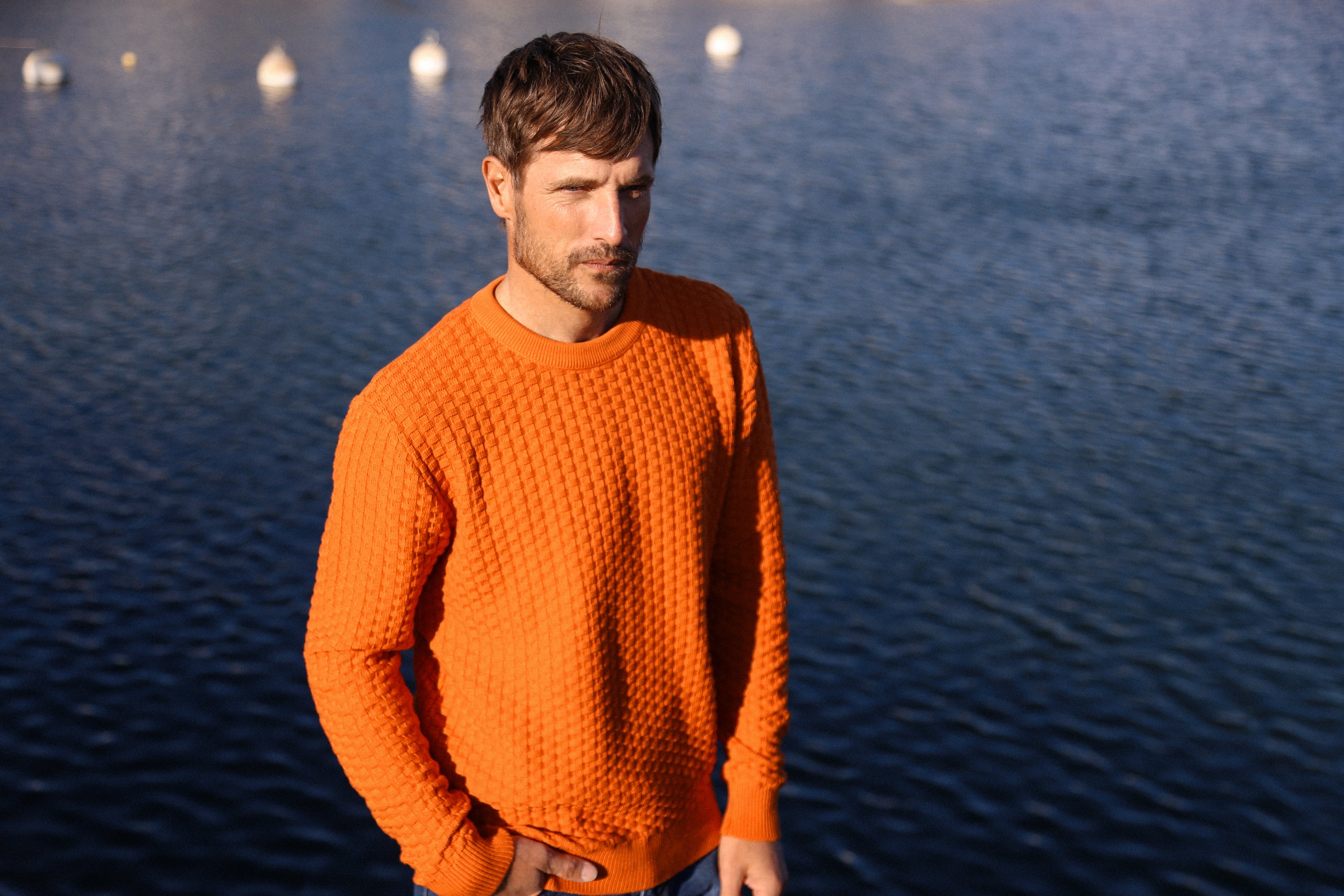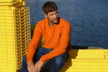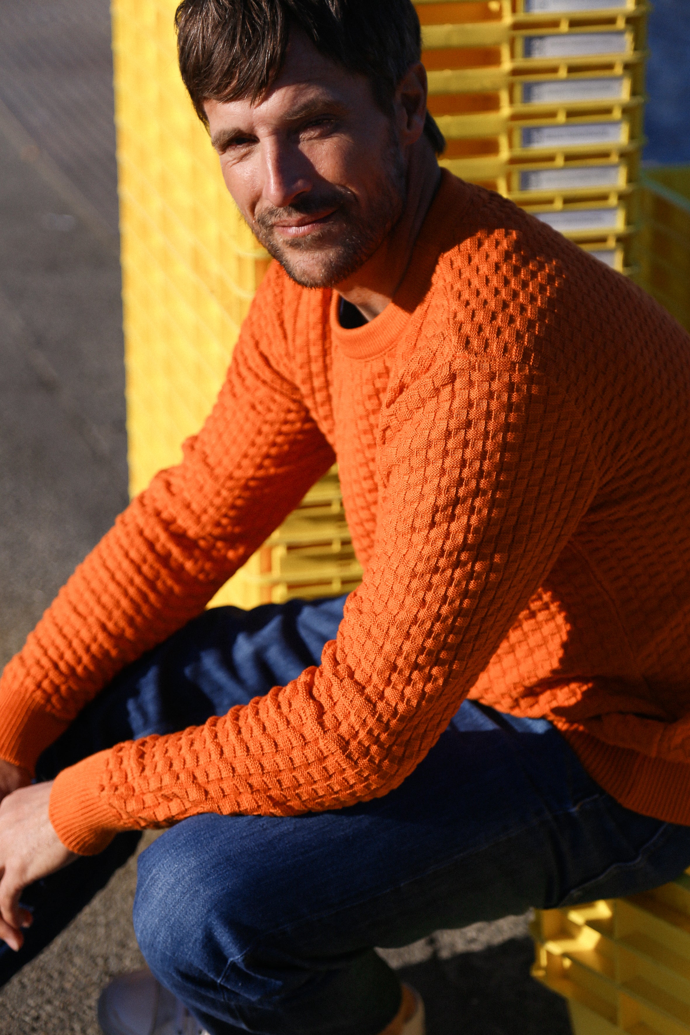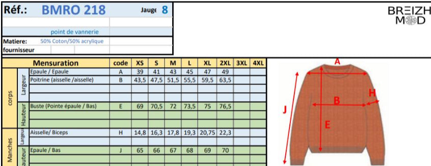 Le pull est tricoté, coupé et cousu à Rohan (56) en point de vannerie (effet damier) avec un fil de jauge 8 en provenance d'une filature allemande.